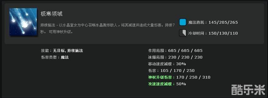 极寒领域作为冰女的终极技能有着685码的施法范围,在该范围内的敌人将受到7秒的持续伤害,每次冰晶轰炸将造成105/170/250的伤害,而且可以A杖升级,攻速移动速度减缓将由30%提升到50%,并且伤害也明显大幅度提高到170/250/310。大招作为冰女的大规模爆发输出需求的环境近乎苛刻:要求冰女不动持续施法,受到眩晕技能或者走动将停止施法。所以操作起来颇为讲究,不过一旦冰女成功释放一个完整的大招并且击中大多数敌人将造成成吨的法术伤害。遗憾的是此技能不能对bkb的英雄造成影响,所以有bkb带stun技能的英雄是冰女释放该技能时最不想看到的。