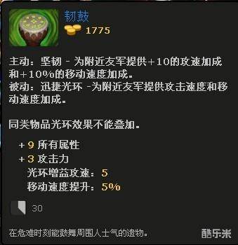 战鼓可以让你的移动速度追杀逃跑更加的流畅,而且提升的团队效果和9点所有属性也是不容忽视的。