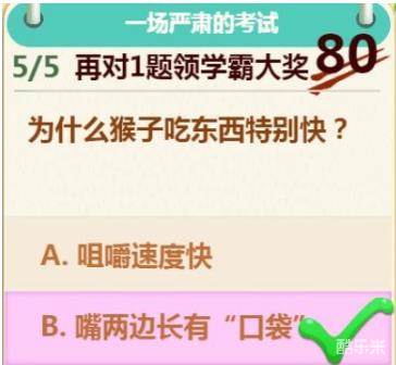 因为猴子吃东西先不嚼的,直接放进腮帮的口袋里。然后抢到嘴里了再慢慢咀嚼这样安全且不会被抢食。选B。