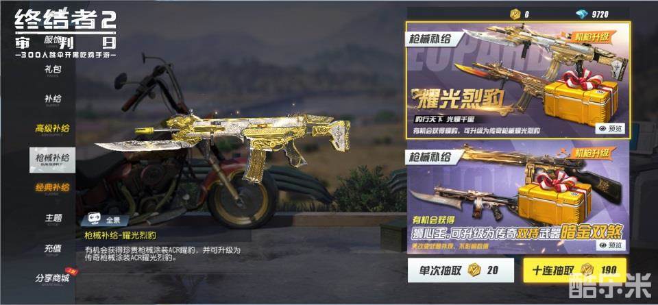 此次更新中,玩家将迎来ACR全新皮肤“耀光烈豹”,凶猛的野兽飞速出击,谁人能够阻挡?ACR是游戏中颇受欢迎的一款突击步枪,该步枪属性均衡,适用性广,后坐力极小,射击手感十分舒爽,搭载“耀光烈豹”皮肤后,ACR瞬间变得霸气炸裂,你能否带着这匹烈豹,席卷吃鸡战场,成为最耀眼的赢家?