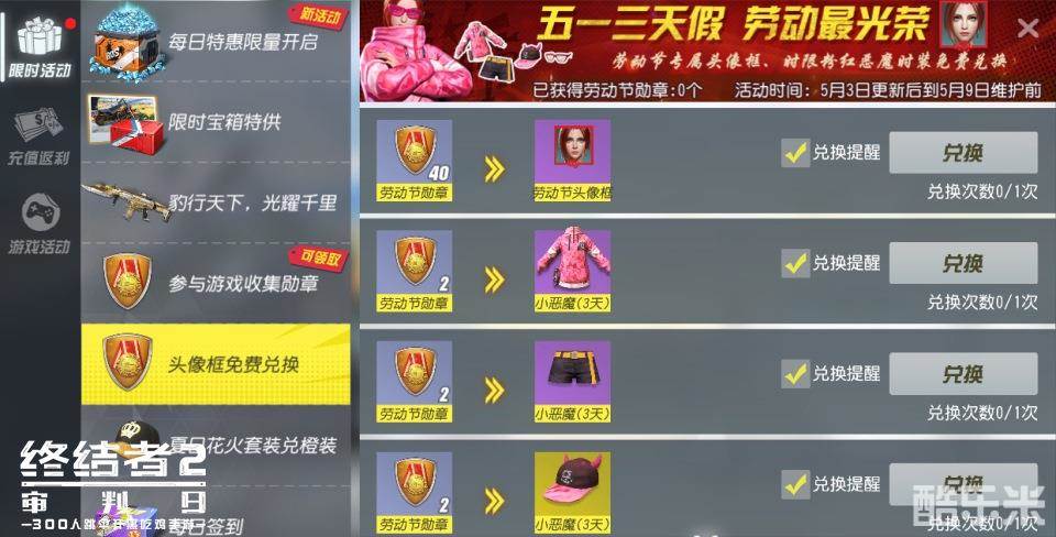 活动将于今日开启持续至5月9日,活动期间,玩家完成登陆、完成一次特训任务、领取周卡等劳动节任务,即可在活动界面领取劳动节勋章,勋章可用于兑换碎片宝箱、新品特惠、粉红恶魔时装,劳动节头像框等诱人奖励。一份付出,一份收获,用你的汗水,换取属于你的劳动节礼物!