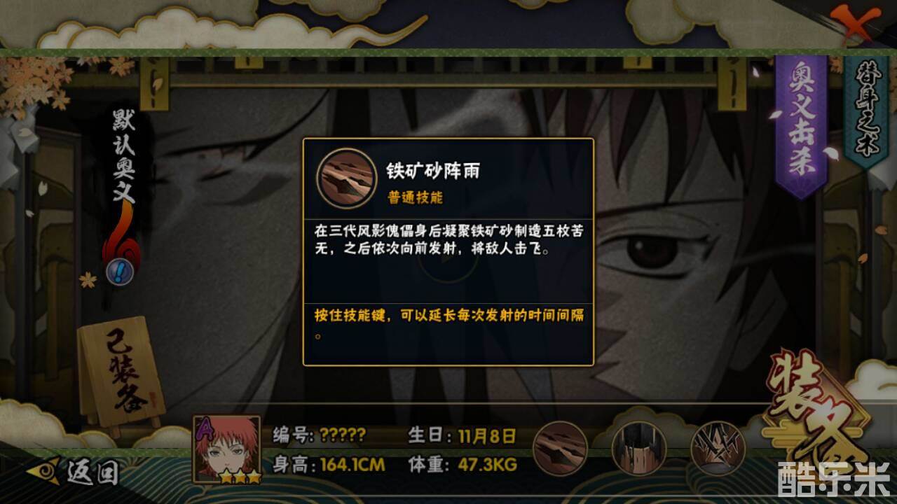A技能—铁矿砂阵雨:三代风影傀儡身后凝聚五枚砂苦无,之后以X轴为基准上下依次发射。按住技能键,可以自行延长发射的时间间隔。