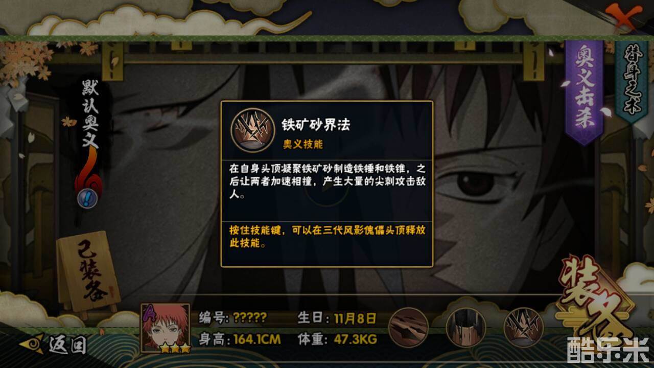 奥义—铁矿砂界法:在自身头顶凝聚铁矿砂制造铁锤和铁锥,之后让两者加速相撞,产生大量的尖刺攻击敌人。