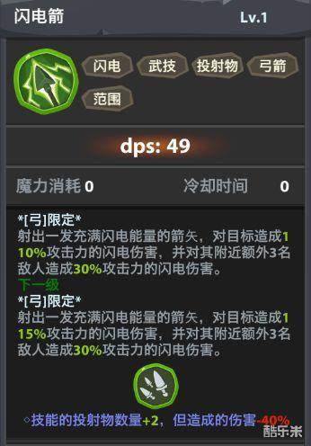 下图就是在一件装备上同时镶嵌了闪电箭和多重投射技能,闪电箭从单体伤害技能直接就变成了一个群攻技能。