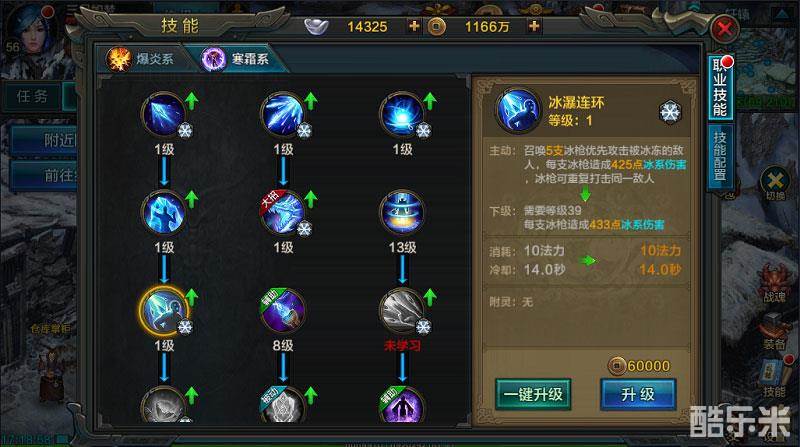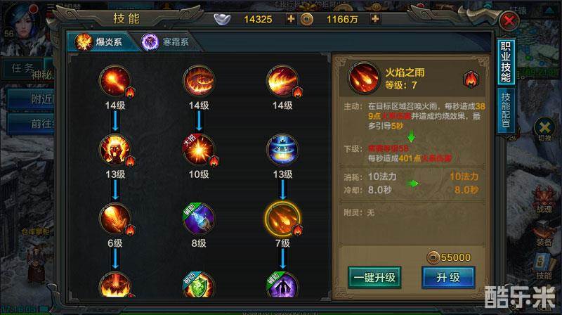 职业技能:法师技能分为爆炎系和寒霜系两个系列。