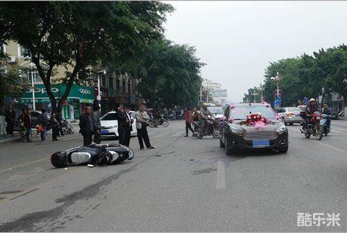 一辆迎亲小轿车由于引擎盖上摆放的小熊布偶位置过高,遮挡住驾驶员视线,导致小轿车撞上一辆正要过马路的电动车,事故造成电动车驾驶员受轻伤。