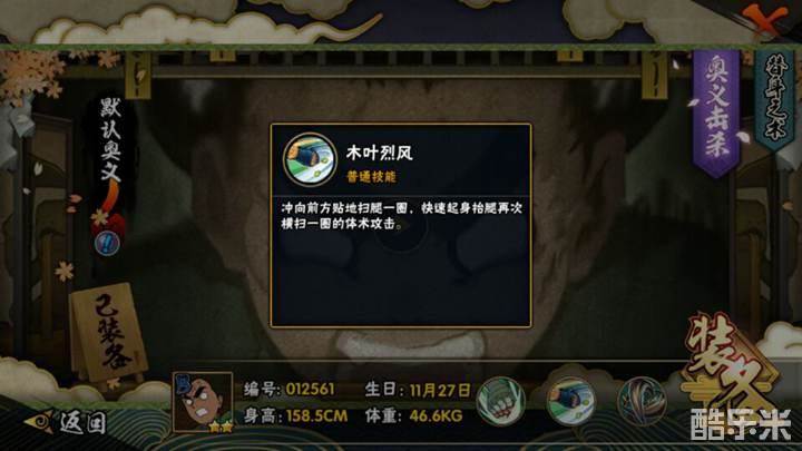 二技能―木叶烈风:快速前冲贴地扫腿一圈,起身后再次横扫一圈将目标踢至空中。