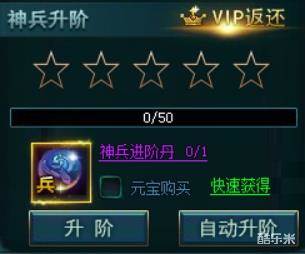 3.每升一阶神兵,神兵淬炼丹的服用上限会增加,为玩家带来更多属性与战力