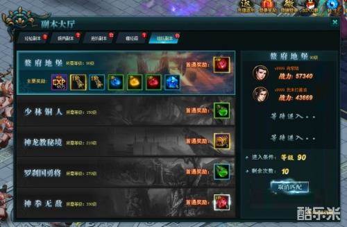 游戏中为玩家提供了极为丰富的副本玩法,其中分为经验副本、银两副本、进阶副本、藏经阁、组队副本五种
