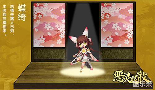 蝶绮是一个单纯可爱的蝴蝶妖精,她为困在迷途中的人们指引方向。没想到这样一个天真的小女孩也会展露出陷入爱情、情窦初开的害羞模样。在《恶灵退散》中,蝶绮属于辅助治疗型式神,她的治疗技能能够恢复己方两个目标63%攻击力的血量,在战斗中提供持续的后方补给。
