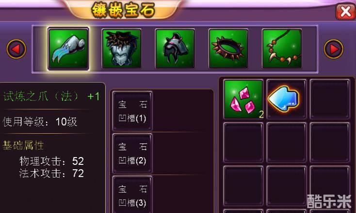每件装备都有5个可以镶嵌宝石的凹槽,最多可以镶嵌5颗宝石。5个凹槽中,每个凹槽内可放置宝石各不同,具体如下: