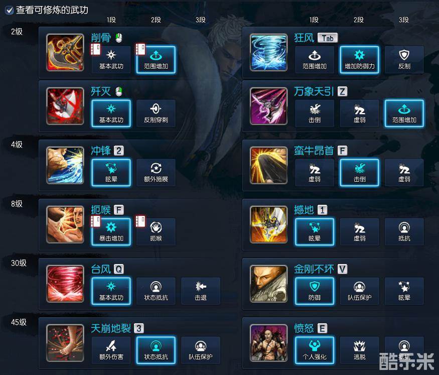 上面是暗力士的技能加点,特别提出的是范围增加的万象天引,抵抗异常状态的天崩地裂。