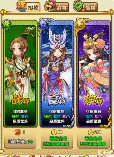 招募:(酒馆中招募武将可分为三种) 战将:消耗1个女儿红招募1次。有几率获得绿色、蓝色品质武将。 良将:消耗88金币招募1次。有几率获得绿色、蓝色、紫色品质武将。 神将:消耗288金币招募1次。有几率获得蓝色、紫色品质武将。 武将:武将页面可查看已招募武将的信息,以武将职业分类,品质由高到底展示; 信物:玩家收集的武将信物都会显示在此界面。武将信物图标显示为六边形的武将头像。