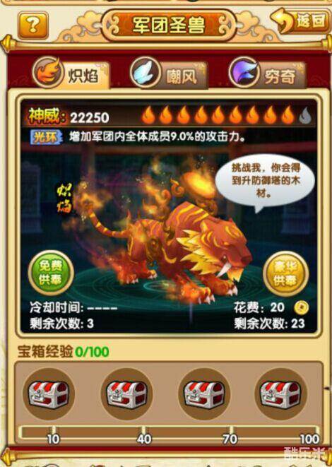 军团 等级升到30级就能创建或者加入军团了。 每天可膜拜军团内等级比自己高3级以上的玩家,膜拜后都可以得到体力值,被膜拜的玩家可以得到银币。 将星台,凑齐5名武将即可激活将星台,与其他玩家一同完成将星台会获得更多的银币和突飞令; 军团副本需要全军团的玩家一起挑战关卡,获得副本奖励; 圣兽供奉需要军团成员集体供奉,提升圣兽神威值: 圣兽一共有3只,分别是圣兽:炽焰、嘲风、穷奇 每个圣兽有各自单独的等级、攻击力、血量、速度、防御、神威星级 圣兽神威值升星后,可以为军团内全体成员增加属性的光环; 光环技能对军团副本、军团战、圣兽挑战有额外的属性加成。 圣兽挑战是军团成员分别攻打的一个BOSS,可获得少量军团币和材料的奖励。