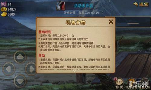 首先,要参与军团突袭就要做好一系列的准备工作,一般在《三国之刃》中军团突袭活动的开启时间为21:00—21:10,只持续短短的10分钟。但要在这10分钟内争取排名至前16名甚至要击破城门就需要整个军团的团结一致。在集结的时间上,肯定都要提前15分钟进行集合,这样团长才能确定参与突袭的人数,看是否需要使用军团鼓舞。如果要最快速度击破城门则需要分配多少人一起使用军团鼓舞的功能。