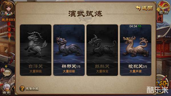 在游戏中,演武试练都有其特定的开放时间:例如辟邪关以及狻猊关会在周一、三、五开放,而白泽关、麒麟关则会在二、四、六开放。不过在周日当天,四种关卡都会全天开放,想获得所有资源奖励的玩家周日就一定要上线喔!