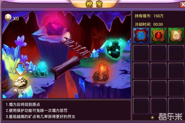 1. 每次挖宝成功将开启一下一个可挖掘的矿点,塌方后将回到原地。