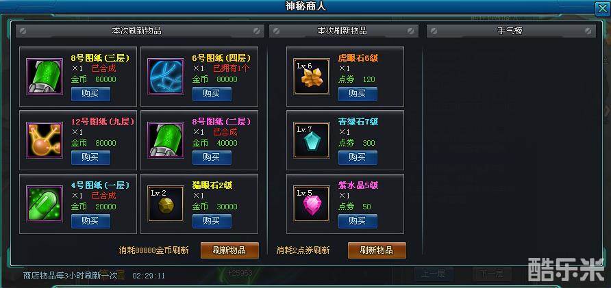可在此刷新并购买得到合成基因的图纸和材料以及镶嵌装备用的宝石