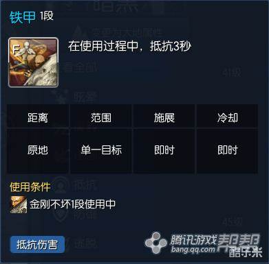 3、新增铁甲技能,使用过程中抵抗3秒(金刚不坏1段使用时触发)