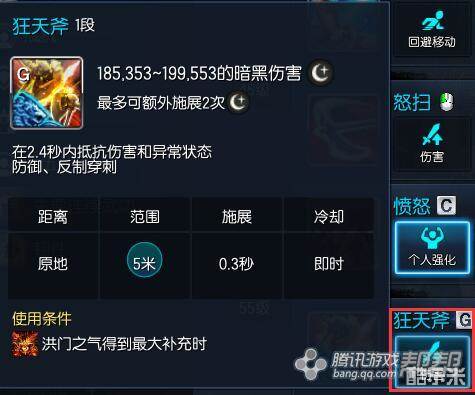 狂天斧非常炫酷,伤害也非常高,可以连续施展3次,三次使用完需要7秒