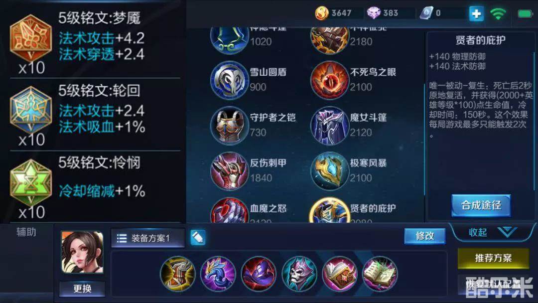 前期不管保不保命,肯定是要先叠加法强的,而疾步之靴在则能更快的支援队友!而之后,回响,帽子,面具这个三件是必须的,后期的贤者之书也是可以依情况而定,复活甲和辉月都是能出的!铭文则推荐梦魇+轮回+怜悯,配合噬神之书法术吸血高达35%!