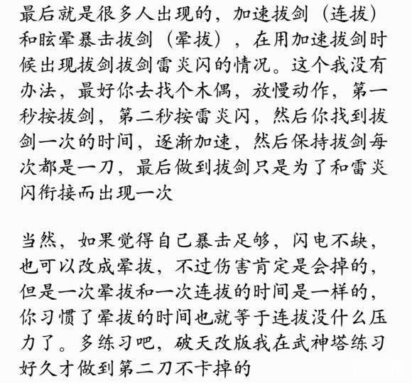 然后是对雷炎闪的解析。雷炎闪之后拔剑会变成快剑,也就是说只要雷炎闪完全打了出来下一刀的拔剑一定是加速的快剑(快剑比拔剑快一丢丢,不知道我的错觉还是真的这样)