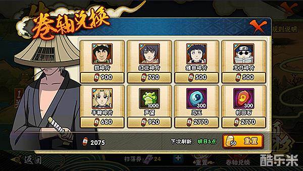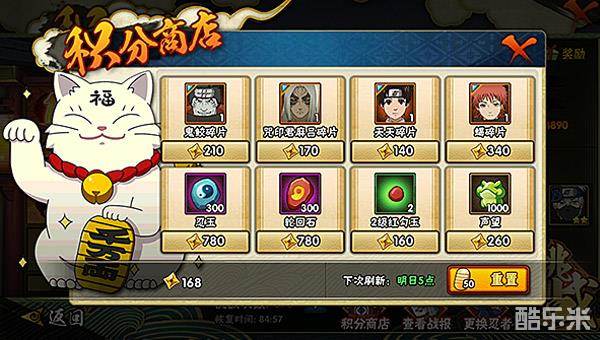 积分赛:每天可打六场,比赛结束会奖励铜币和积分。积分可在积分商店换取忍者碎片,以及忍玉、声望等各种提升战力的道具。每天的六场都建议打完,无论输赢都是会奖励金币的。而积分兑换建议集中一个忍者进行兑换,这样相对来说性价比会高一些。若已有该忍者,可根据自身来兑换其他东西。