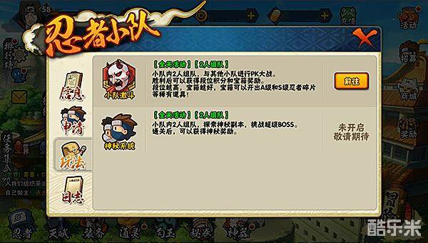 忍者小队:尽量加入一个活跃度高的小队,每天都能进行决斗,决斗后可获得宝箱。