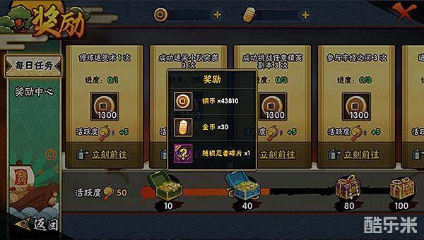 任务:每日的活跃度任务要做完。奖励颇多,更是有金币和忍者碎片。