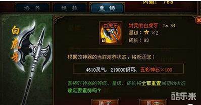 神器重铸时,所有的等级、星级、绝技什么的都会发生变化,最主要的是用于提升星级和等级的五彩神石、灵气都会返还。所以有许多玩家利用这个功能来返还灵气,具体的操作方法为:先用元宝提升神器的成长,然后重铸返还灵气,从根本上说是用元宝换灵气。这个方法适合新区冲级当武林排行榜的玩家。