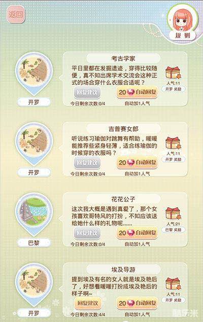 但是,在区域任务中,我们是无法切换区域的。即使是你某个区域的好感度已经满了,还是会出现该区域的任务,除非你完成这项任务,否则使用自动回复、留到隔天,都是不会改变任务的。最好能够在前一个区域达成三分之一好感度以后就解锁下一个区域,这样安排下来才可能差不多同时解锁套装。