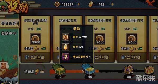 具体分为10活跃度领取第一个宝箱,可以获得铜币和经验奖励。40活跃度领取第二个宝箱,可以获得经验、铜币和10金币的奖励;80活跃度领取第三个宝箱,可以获得铜币、经验和20金币的奖励。最后一个宝箱需要100点活跃度,可以获得铜币、金币和随机一个忍者碎片的奖励。