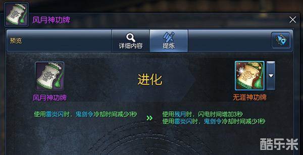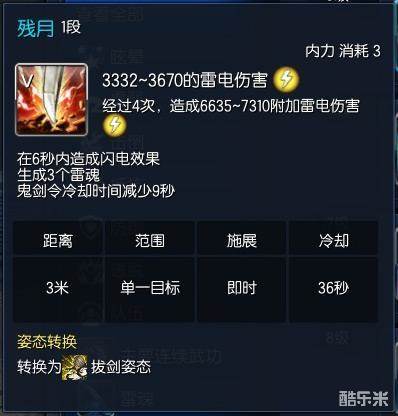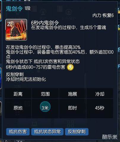 使用雷炎闪时,鬼剑令冷却时间减少1秒;雷鸣斩命中时残月冷却时间减少18秒。