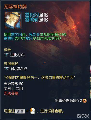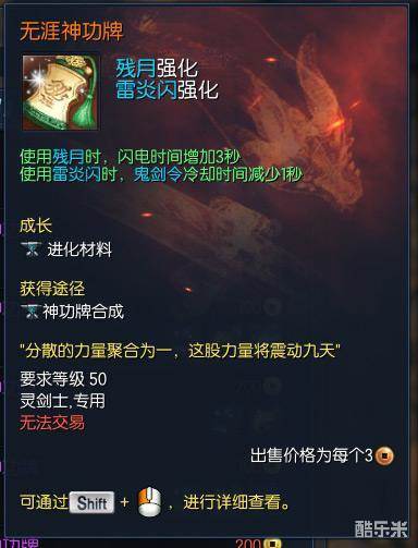 传说神功牌的合成除了要两个原材料神功牌以外还要800神丹,8个预计不便宜的新材料以及原价1000金的手续费,其高昂的成本与实际提升来说性价比较低,当然,土豪随意啦。结合之前说的,雷灵剑要做传说神功牌的话,还是更推荐无际神功牌。