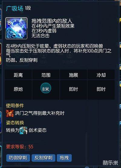 随着西洛的出现等级上限也开放到了55级,新增55级奥义技能“破天剑轮(快捷键G)”“广吸场(快捷键B)”,升到55级自动学习,洪门之气攒满时可以释放,一个是类似扎汗跳起来竖着转的伤害技能,一个是类似扎汗魔气域吸人的大范围控制加虚弱效果,让人很疑惑灵剑是不是去找扎汗拜师了。。。不过效果还是很不错的,实际应用方法各位自行体会,要注意的是广吸场B无法合击,想用虚弱五连双虚弱风月与广吸场完成一人四控的还是要遗憾了。