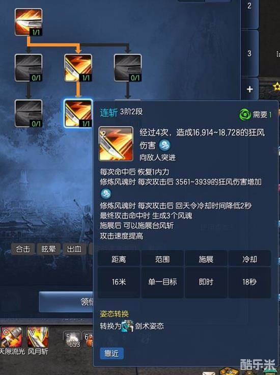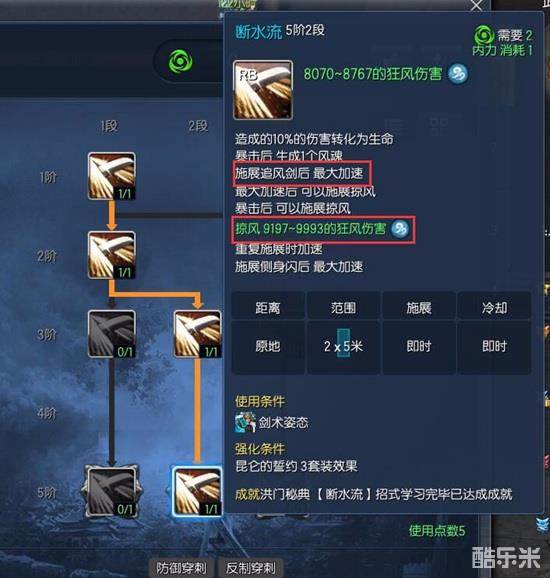 推荐理由:断水流是平时使最多的技能用来叠风魂,该分支技能伤害最高,而且使用连斩后可以最大加速施展。
