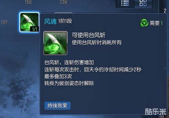推荐理由:左键施展后可以直接施展台风斩,很好的弥补了有3个风魂时用了非断水流技能后不能衔接台风斩的尴尬处境。特别是3风魂使用回天令后,可以使用左键触发台风斩后打断水台风卡刀。