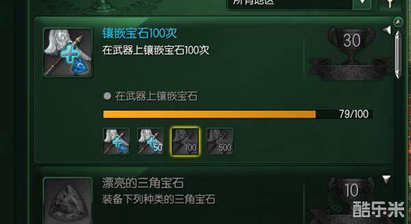 像镶嵌宝石这样的成就,现在镶嵌宝石不需要费用了,你只要点100下这个成就就能拿走了。还有水月平原蓝色副本只要通关一次就能有成就,还有更多的成就玩法你自己挖掘!一个人完成不了的时候可以在势力喊喊,如果还是没有人的话,你可以先留着以后做,