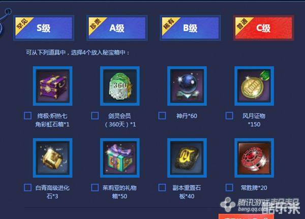 而对于C级来说,可以入选四个放入秘宝箱之中,终极炽热七角彩虹石箱子可以自己用也可以直接拍卖卖掉;剑灵会员一年,市场价100块左右;神丹60颗,这个东西是做传说秘功牌必不可少的材料,价值约1140金左右;风月证物是兑换神功牌用的,没什么价值;白青高级进化石3个大概是300多金;茱莉亚的礼物箱50个折合rmb50元(会员价);重置石对于大部分人是不缺的,除非是那些带老板的;常胜牌20个,市场价4块钱一个。