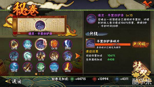虽然我们可以在技能冷却期间不停跑位来尽量躲避敌人,但不可避免的总会有敌人靠近我们。当敌人近身攻击时,手鞠【疾风传】不得不为生存而考虑。既然本身技能没有自我保护能力,那么我们就可以考虑携带防护型秘卷技能来加强生存,可以携带的秘卷技能有:通灵·手里剑护身、通灵·雷光剑化、火遁·鬼灯笼等。