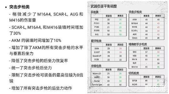 从蓝洞官方给的武器伤害变更图可以看到突击步枪除了AKM和Groza伤害没变以外,5.56家族突击步枪伤害都降低了一点。其实这并没有太大关系,重要是换弹时间和后坐力都有所增加。即使加上各种握把枪口和枪托,照样飘成马,后坐力简直跟AKM一个等级!这显然蓝洞想让玩家多练AKM的节奏啊。