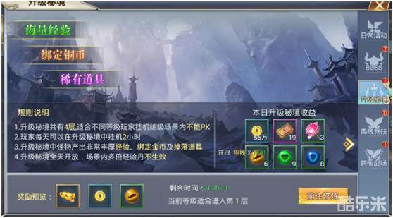 升级秘境,顾名思义是道友们提高等级的地方,在日常活动中可以进入升级秘境。场景一共分为四层,包含了80级以上等级的玩家都可以在其中找到対应其等级的小怪,进行挂机练级,解放双手轻松提升战斗力。在升级秘境中的收益会在进入界面显示而出,道友们今日获得的额外道具奖励一览无余。