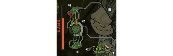 (2)很快浮岳龙会进入P2阶段,玩家需要分成2队,1队进入3区或者4区,将内侧爪子逐一打成红色(小地图),而另一队则待外侧变红后,将2区对应爪子逐一打红,当2区同一侧(3区或者4区下面2根)都变红以后,浮岳龙会坠落。进入P3。异常气体吸满以后会慢慢弥漫在2区,当30 s的氧气用光以后,猎人会迅速死亡,换区可以进行一次换气重置。