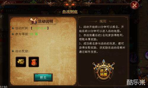 当玩家达到55级后,即可在活动时间13:00-13:40前往土城-与血战到底活动使者对话进行报名。活动开始前10分钟可以报名,开始后前10分钟可以进入活动地图。存活到最后的1名玩家获得胜利,领取丰厚奖励。成功报名参与活动的玩家,都可获得安慰奖励,该奖励在活动结束时通过邮件发放。