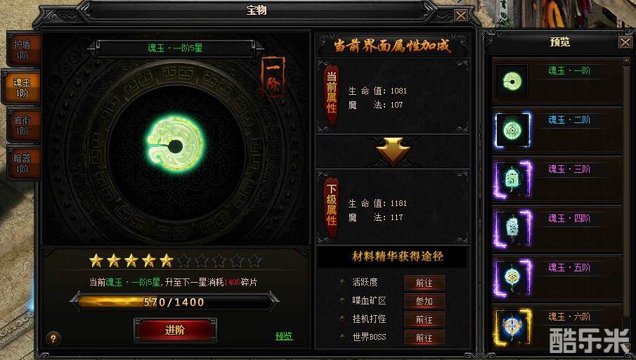 角色达到34级开启魂玉,玩家可以在主界面的宝物面板中打开魂玉页面。