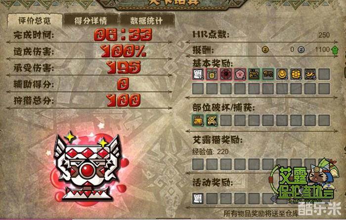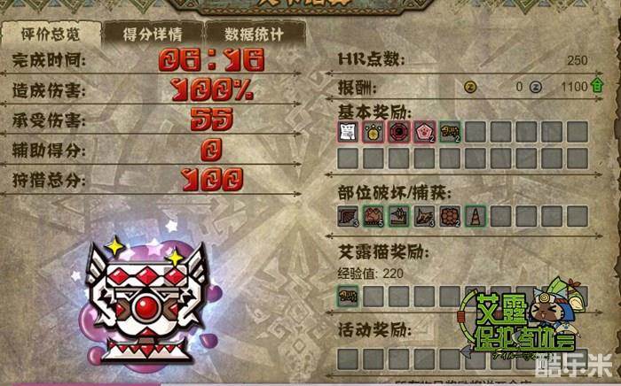 因为小编我之前没什么OL笛子的单刷经验,所以就选了“精英轰龙”和“精英一角龙”测试,加上前段时间轰龙肝的很多所以做了一把55的轰龙笛子进行测试,0强化觉醒满,防具除了KO术几乎和笛子不搭边,最后用时证明即使是我这种不怎么熟练随便抓了套配装的人练了几把也能打进白金。