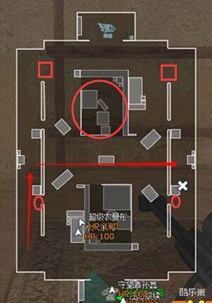 中心大椭圆形处可以打游击战房间两侧是相通的。箭头处向右可以辅助右侧队友击杀敌人。