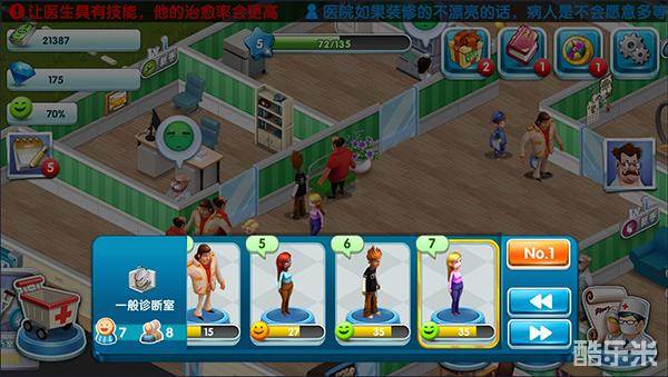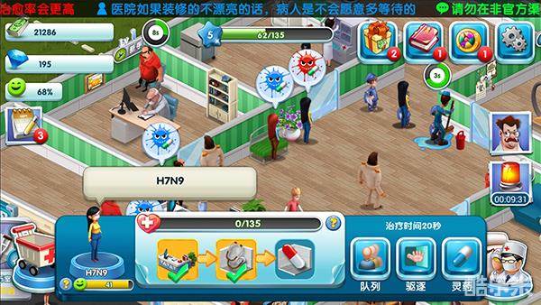 游戏初期玩家们只有一个初级诊室,但是病人却络绎不绝的涌进来,这时有些病人的病症很急,如果不趁着病情加重前医治,那么很有可能会夺取病人生命哦!