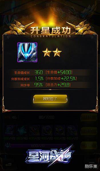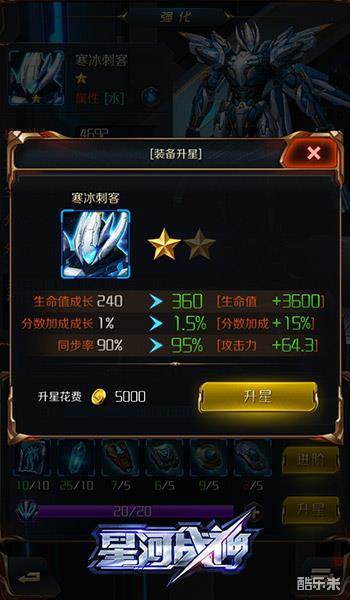 在挑战关卡过程中增加分数加成也是升星的一大优点。此外,与机甲的攻击力息息相关的同步率也会在升星过程中有所增加。当寒冰刺客升级为二星时,同步率上升到95%,攻击力增加了64.3。赶快行动,去为自己的寒冰刺客升星吧!