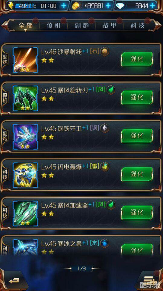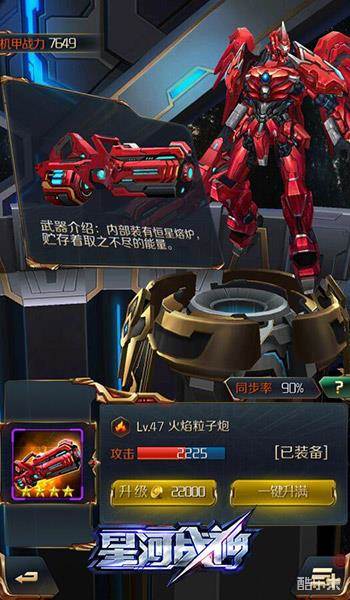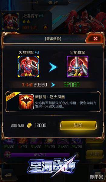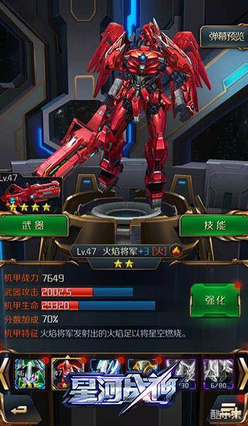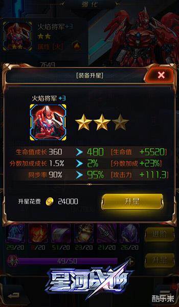 再来就是升星,升星影响机甲生命值成长、分数加成成长和武器同步率。火焰将军本身是两星机甲,升到三星并不难,每天坚持扫荡可掉落零件的关卡不日就能三星。但是升级到四星就需要有足够的耐心,因为这需要100个零件作支持。